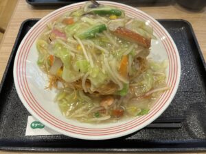 長崎皿うどんはリンガーハットで長崎ちゃんぽんに次ぐ主力商品で、具材はたっぷりのままチキンベースの餡を揚げ麺に絡めていただきます。